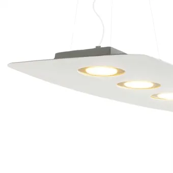 Estructura de metal BLANCO y anillas en PAN DE ORO . Bajo pedido, el aro central es intercambiable en los colores pintados de blanco para un efecto monocromático, negro, gris o arena o decorado en pan de plata, oro o cobre.La suspensión está equipada con cinco portalámparas hacia abajo y dos hacia arriba. con casquillo GX53 para bombillas LED de 7W máximo excluidas.