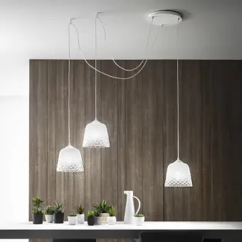 Lámpara de araña formada por tres gotas de vidrio trabajado que en su composición la hace singular y elegante. Una lámpara de techo apta para superficies de apoyo o para colocar en el centro de la habitación y amueblar toda la estancia, como el efecto de un racimo de uvas. Gracias a la descentralización es posible acercar los puntos de luz donde hay mayor necesidad de iluminación.