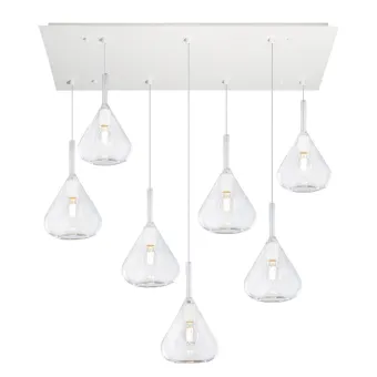 La araña moderna 1177 S7 tiene una base rectangular plana en un acabado blanco anónimo. La forma geométrica esencial se enriquece con siete calatinas asimétricas, perfectamente integradas en la estructura. Cada calatina está equipada con un difusor de cristal transparente, que encaja perfectamente en la estructura y que permite una difusión uniforme y homogénea de la luz. La base utiliza una bombilla LED E27, que garantiza una iluminación eficaz y eficiente, sin consumir demasiada energía. La araña moderna es perfecta para decorar ambientes contemporáneos, minimalistas y de diseño.