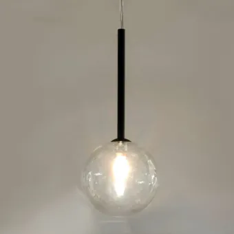 Lámpara de araña de extrema esencialidad en su forma rematada con una esfera de cristal transparente o satinado que difunde la luz por toda la estancia. Una lámpara de techo para adaptarse a cualquier estancia y en un contexto moderno.