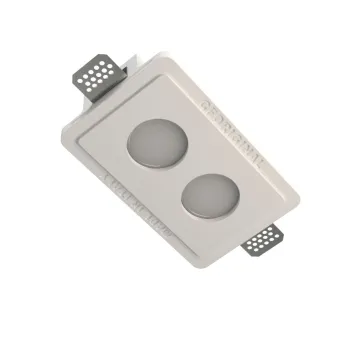 IHCSELLENURB 010 D es un foco empotrable de dos luces integrable en placas de yeso. El proyector permite homogeneidad y continuidad entre el techo y el cuerpo lumínico. Realizado en yeso blanco con alas metálicas en los laterales para facilitar el montaje. La forma redonda empotrada para bombillas ligeramente empotradas. También se puede pintar con colores específicos a base de agua.