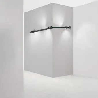Iluminación de pared y techo modular con bases de 4 o 2 focos. Articulaciones en T, de 45°, 90° y de 90° para ángulos internos o externos disponibles bajo pedido .