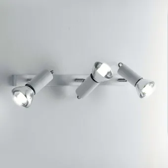 Estructura en metal blanco o cromo pulido. El carril con spot está equipado con tres portalámparas E27 para bombillas LED de 10W con un tono de luz cálido de 3000°K. Bombillas incluidas.