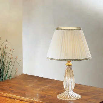 Lámpara de sobremesa clásica y elegante en cristal soplado preparada para enriquecer cualquier superficie de apoyo que se quiera iluminar. Rematado por una pantalla artesanal que difunde la luz y crea un ambiente de agradable compañía. Ilumina con clase. Hecho en Italia