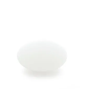 Esfera aplanada de 38 cm de diámetro con base de metal rugoso pintado blanco o de polietileno blanco. Difusor de polietileno translúcido.