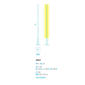 ELLE 2089 T es una lámpara de pie que se presenta como un mueble de carácter purista, perfectamente adecuado para completar espacios de vida modernos. Además, la intensidad de la luz se puede ajustar con el TOUCH DIMMER .