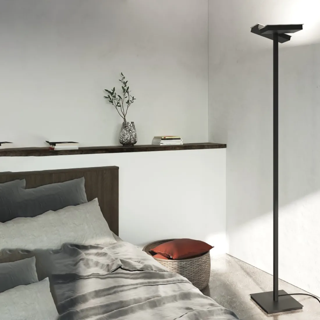 Lámpara de pie moderna con un diseño simple y obvio. Una lámpara de pie con emisión de luz orientable dirigida hacia arriba que ilumina indirectamente y se integra perfectamente en el mobiliario circundante. Mínimo, esencial y eficiente sobre todo en términos de energía.