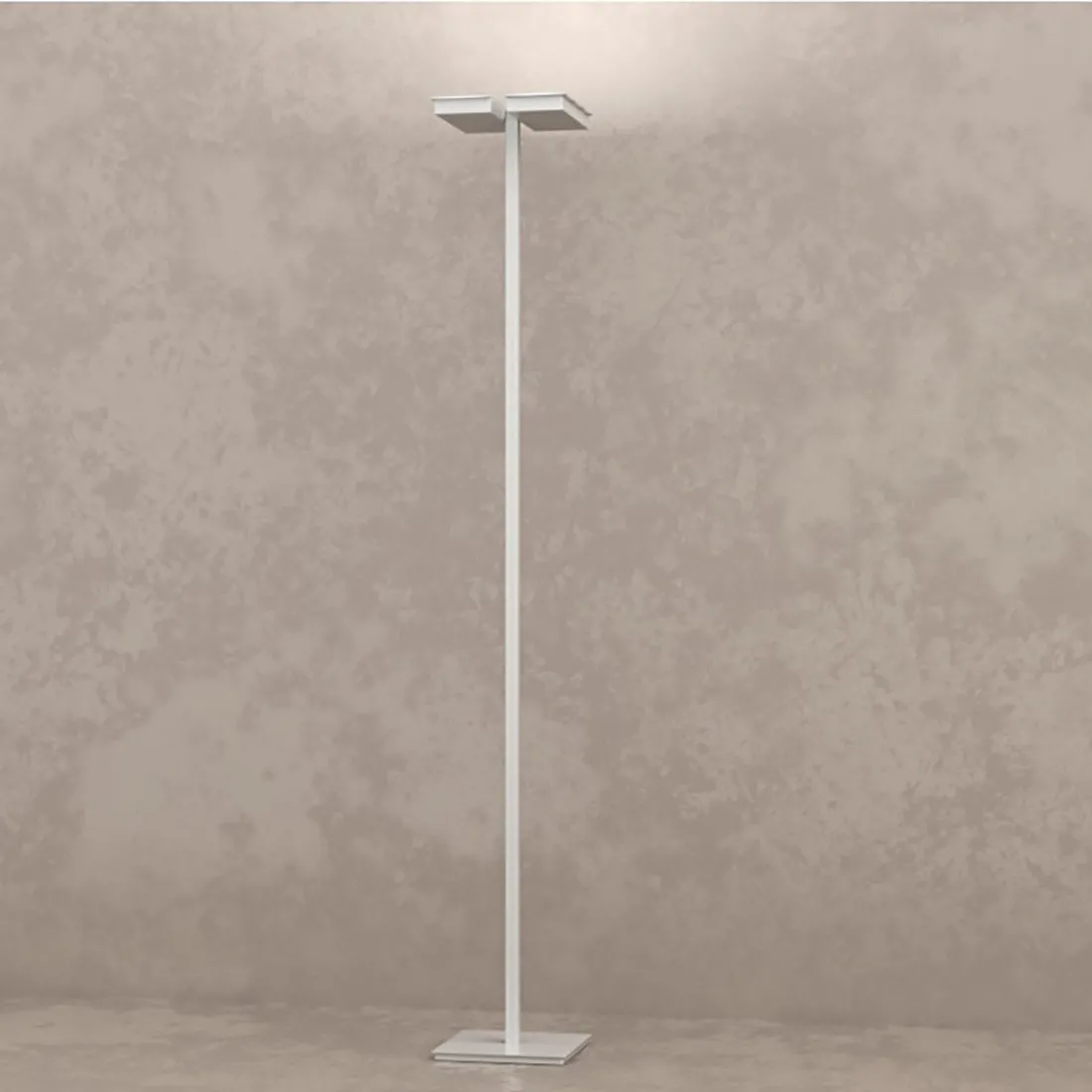 Lámpara de pie moderna con un diseño simple y obvio. Una lámpara de pie con emisión de luz orientable dirigida hacia arriba que ilumina indirectamente y se integra perfectamente en el mobiliario circundante. Mínimo, esencial y eficiente sobre todo en términos de energía.