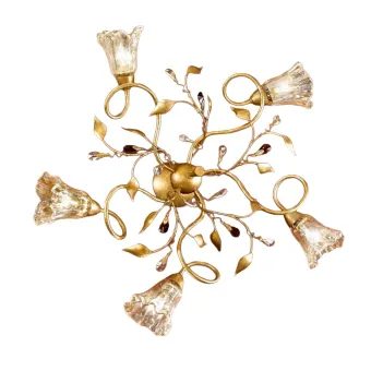 EMMA PL5 está fabricada en metal con un refinado acabado en oro francés, que añade un toque de elegancia clásica a cualquier espacio. La estructura está adornada con espléndidos cristales almendrados, que alternan tonos ámbar y transparentes, que capturan y reflejan la luz, creando juegos de luz cálidos y envolventes. EMMA PL5 está diseñada para instalación tanto en techo como en pared, ofreciendo una gran versatilidad. Gracias a su sofisticado diseño y al brillo de los cristales, no solo proporciona una iluminación eficaz, sino que también se convierte en un elemento decorativo que atrae la atención y realza el espacio con su elegante y distintiva presencia.