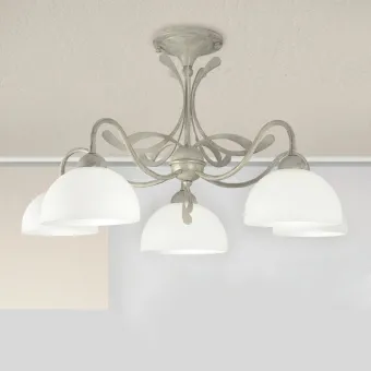 La estructura del plafón es de color marfil plateado con cristal en forma de cúpula en color blanco satinado como en la foto (el marco también está disponible en cristal marrón oscuro o marfil dorado y cristal satinado crema).