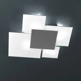 Cristal extraclaro serigrafiado en blanco, gris, arena, marrón, gris antracita o decorado a mano con pan de oro, plata o cobre. Metal cromado pulido. El plafón se completa con cuatro portalámparas E27 para bombillas LED. Lámparas no incluidas.