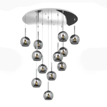 Lámparas de suspensión compuestas por 12 ampollas de vidrio Pyrex soplado regulables en altura. Estructura de metal cromado pulido. La lámpara de techo está equipada con 12 casquillos E27 para bombillas LED de cualquier potencia. Bombillas excluidas.