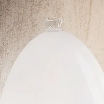 Pantalla de cristal soplado con una original forma de huevo que difunde la luz por toda la estancia. Una lámpara de sobremesa realizada en dos variantes de color, amarillo pajizo y blanco, ideal para colocar en cualquier tipo de mueble, clásico o moderno.