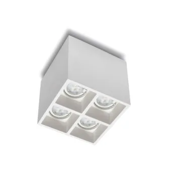 Plafón cuadrado de cuatro luces de yeso blanco que también se puede pintar como el techo de abajo. Un plafón multiluz de luz concentrada para adaptarse a cualquier estancia y para cualquier uso. Un producto Made in Italy.
