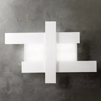 Lámpara de techo o pared moderna, geométrica y singular en su diseño, un juego de perfiles simples que crean movimiento y al mismo tiempo amueblan la estancia. Una iluminación difusa y bien distribuida. Sin conductores.