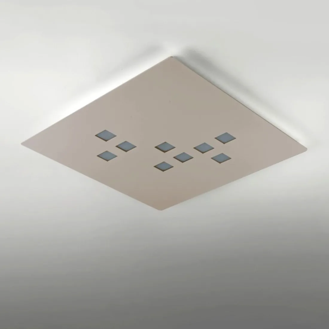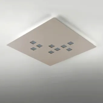 El aplique o plafón está formado por un panel metálico muy fino con orificios cuadrados para iluminación difusa, disponible en los colores: blanco, gris o arena.