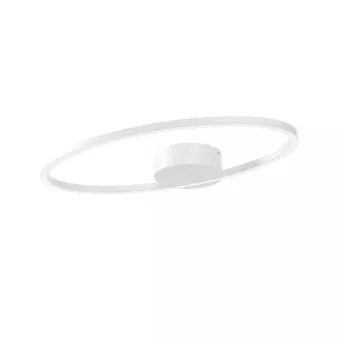 Su diseño circular ovalado con base central desplazada hacia un lado crea un efecto visual único, manteniendo el equilibrio estético del círculo luminoso. La combinación de aluminio pintado y un difusor de PVC blanco satinado garantiza una iluminación uniforme y sin deslumbramientos, ideal tanto para entornos domésticos como profesionales.