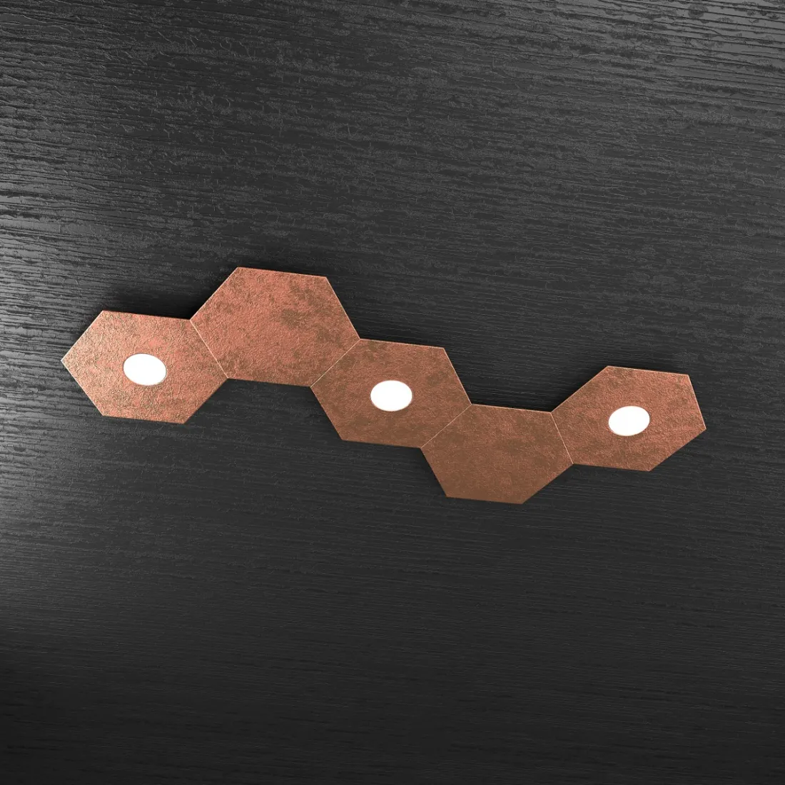 Colección de lámparas hexagonales formadas por placas de metal pintadas en diferentes acabados, BLANCO, GRIS, ARENA, MARRÓN, GRIS, ANTRACITA, HOJA DE PLATA, HOJA DE ORO o HOJA DE COBRE. El plafón monta tres portalámparas con casquillo GX53 para una bombilla LED de 9W máx. excluida.