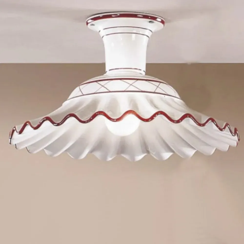 La lámpara de techo consta de un difusor festoneado de cerámica blanca brillante con decoración en marrón, azul, verde o rojo. La lámpara de techo se recomienda especialmente cuando los techos no son muy altos o se necesita una iluminación amplia. El gran difusor emana una luz agradable en la habitación dirigida exclusivamente hacia abajo; el plafón 2383 encaja perfectamente en ambientes clásicos, rústicos o campestres.