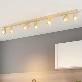 Le dimensioni del binario sono di 142 cm di lunghezza e 5 cm di larghezza, con i faretti che sporgono di 12 cm. Il sistema utilizza 7 lampadine GU10 (non incluse), ciascuna con potenza massima di 9W LED, garantendo un’illuminazione efficace, facilmente personalizzabile e sostituibile. È alimentato a 220–240V 50/60Hz ed è classificato IP20 (Classe I).