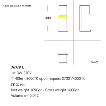 La lampe est équipée d'un module LED intégré de 13W avec des tons lumineux chauds (3000°K) à 1140LM (unité de mesure du flux lumineux), tension à Degré de protection 230V et IP20 donc adapté uniquement aux environnements intérieurs sans humidité.