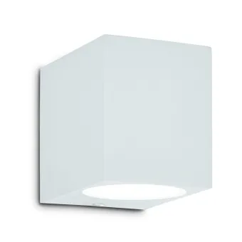 Applique d'extérieur simple avec une forme géométrique. Un petit point lumineux, comme un cube, qui crée de jolis faisceaux de lumière sur le mur. Éclairage indirect avec une touche architecturale.
