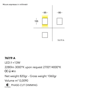 L' applique est équipée d'une double source lumineuse LED 13W dessus et 13W dessous (total 26W) avec des tons lumineux chauds de 3000°K (sur demande 2700°K - 4000°K) à 2280LM (unité de mesure du flux lumineux) . DIMMABLE (la LED peut être atténuée ou l'intensité de sa lumière peut être modifiée).