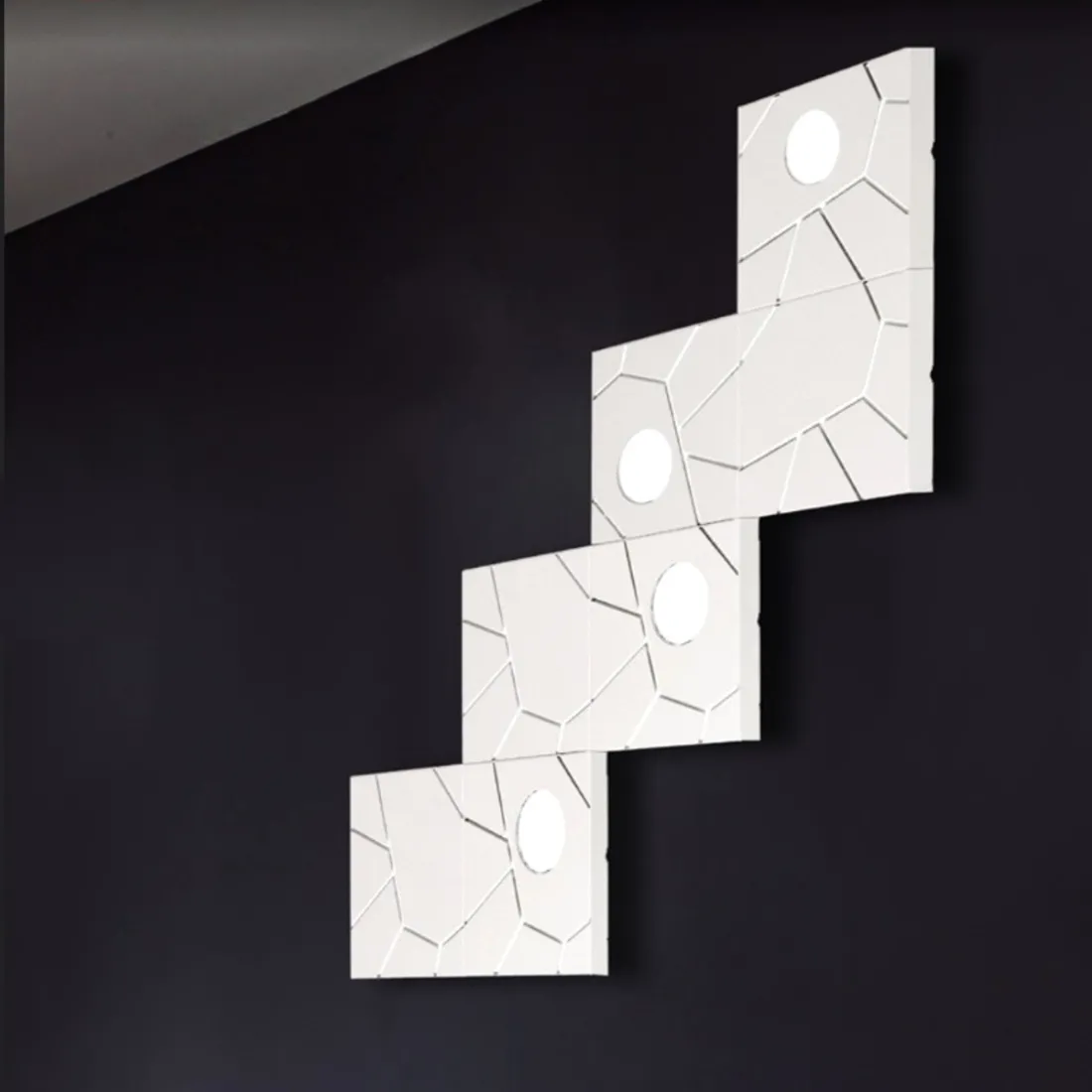 Applique ou plafonnier moderne composé de quatre points lumineux et de quatre éléments décoratifs à lumière indirecte qui décorent le mur comme un beau tableau. Une applique ou un plafonnier à adapter et à personnaliser dans n'importe quelle pièce .. un jeu de petits éléments avec une touche vraiment unique. Un produit Made in Italy.