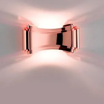 Applique formée par des bandes d'acier habilement pliées à la main afin de créer une forme fluide et compositionnelle. Eclairage avec source halogène et avec possibilité de gradation de la lumière.