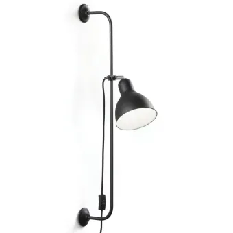 Cadre en métal peint en noir mat. Élément articulé en chrome. Diffuseur réglable. Câble textile avec interrupteur et prise. L'applique est équipée d'une douille E27 pour une ampoule led. Ampoule non incluse.