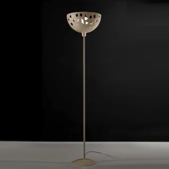 Lampadaire moderne en métal doté d'un diffuseur semi-sphérique perforé original. Ce design unique crée de jolis jeux de lumière et dirige la lumière exclusivement vers le haut. Ce lampadaire est idéal pour les chambres, les salons, les bureaux et les espaces privés ou publics, offrant un éclairage indirect et réfléchi.