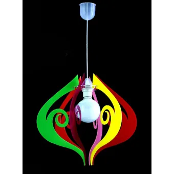 Structure en métal et plexiglas de couleur multicolore (comme photo) ou en option aussi dans les tons rouge-violet-fuchsia-rose-orange-jaune-blanc-noir-bleu ciel-bleu-transparent et vert. Dans le multicolore, vous pouvez choisir les couleurs que vous préférez. Monture en métal, boucles et rosace en plexiglas. Il monte une douille avec douille E27 (grande) pour ampoule halogène, basse consommation ou LED. Les combinaisons de couleurs autres que les photos peuvent être communiquées par e-mail ou dans l'espace réservé à - message du client - lors de la passation de la commande. Lampe non incluse.