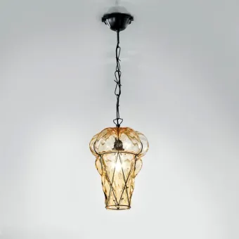 Suspension classique avec un traitement du verre spectaculaire qui prend forme à partir du pliage du fer. Un savoir-faire ancestral revalorisé de nos jours... le verre qui est soufflé et modelé au sein de sa structure. Un retour dans les siècles où les formes évoquent d'anciennes lanternes et auberges à l'époque de la splendeur vénitienne. Fabriqué en Italie.