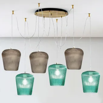 Suspension classique finie avec du verre coloré ambre et vert pour éclairer et meubler en même temps. Un plafonnier à six lumières qui, grâce à la décentralisation, permet de régler la distance entre les points lumineux et également de régler séparément les hauteurs individuelles. Un corps d'éclairage adapté pour éclairer des surfaces d'appui telles que des tables à manger ou pour créer un effet de toile d'araignée au centre du plafond pour un look résolument plus ornemental.