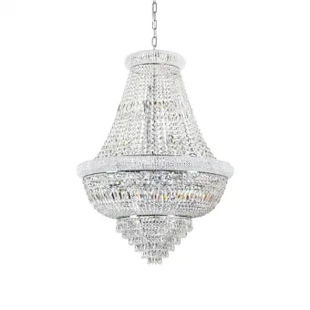 DUBAI 243597 est un majestueux lustre en cristal qui se distingue par sa taille imposante et son architecture lumineuse, capable d'attirer l'attention dans n'importe quel environnement. Composé d'une cascade de petits éléments et de prismes en cristal transparent, il reflète la lumière avec raffinement, créant un jeu de reflets et d'éclats qui enrichit l'espace d'élégance et d'atmosphère. DUBAI 243597 est parfait pour les salons, les entrées scénographiques ou les espaces de représentation. Il allie classicisme et grandeur, transformant la lumière en un élément décoratif de premier plan.