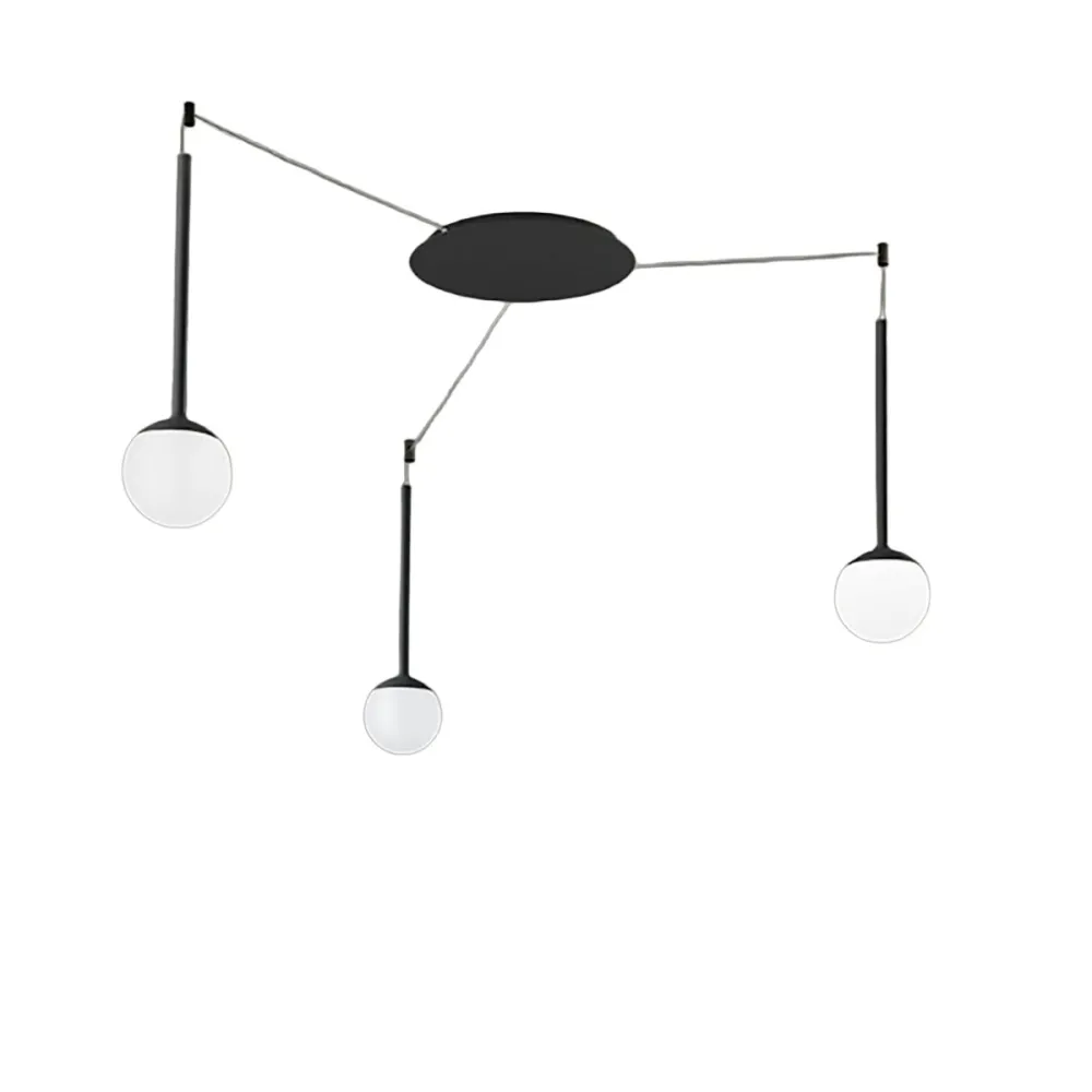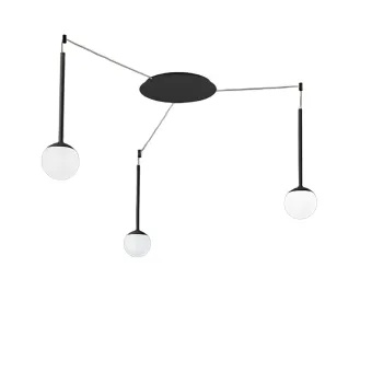 LOLLYPOP S3A NE est un lustre à trois lumières, finition noire, conçu pour offrir un éclairage à la fois uniforme et dynamique. Ses petits cylindres décentralisés permettent d'orienter la lumière précisément où vous le souhaitez, créant ainsi des configurations personnalisées et des effets visuels qui dynamisent l'espace. Cette flexibilité crée un effet original et scénique, évoquant une toile d'araignée lumineuse se déployant au plafond, idéal pour apporter du caractère aux intérieurs modernes ou néo-classiques. La répartition des trois sources lumineuses assure un éclairage équilibré, parfait pour les pièces à vivre, les entrées, les petites tables à manger et les bureaux, pour une lumière diffuse et homogène.