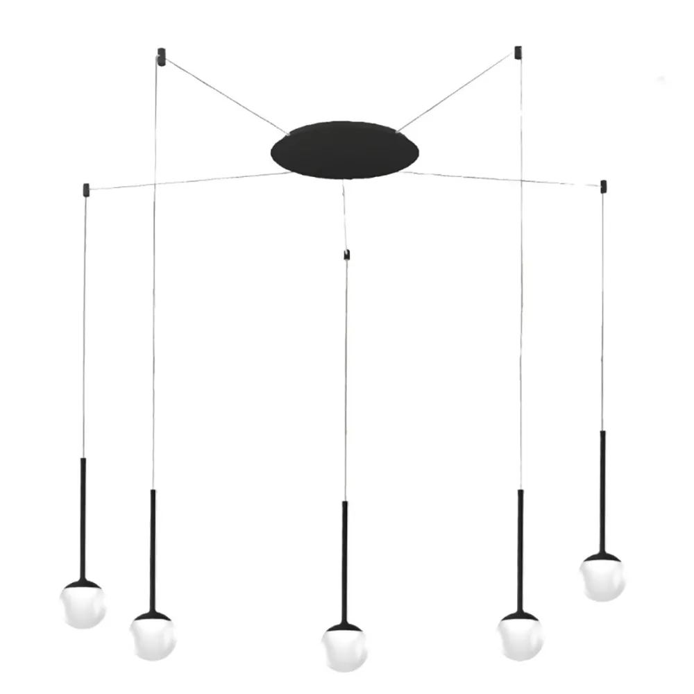 LOLLYPOP S5A NE est un lustre à cinq lumières, finition noire, conçu pour offrir un éclairage large, uniforme et dynamique. Ses petits cylindres de décentralisation permettent d'orienter chaque point lumineux avec précision, offrant ainsi des configurations personnalisées et des effets visuels qui dynamisent l'espace. La grande articulation des cinq sources lumineuses amplifie l'effet scénique, créant une texture lumineuse qui se déploie sur le plafond avec un caractère presque graphique, idéal pour sublimer les espaces contemporains. La répartition des cinq lumières assure un éclairage équilibré, même dans les grands espaces, faisant de LOLLYPOP S5A NE le luminaire idéal pour les salons, les entrées, les grandes tables à manger, les îlots de cuisine ou les bureaux nécessitant une lumière diffuse et uniforme.