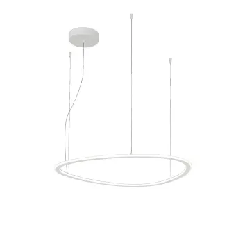 TRIS S65 est une suspension moderne et raffinée. Son luminaire central se compose d'un anneau unique, large et organique, aux formes libres évoquant un médiator, doté d'un diffuseur continu en silicone souple qui crée une ligne de lumière homogène. L'anneau bénéficie d'une double émission, diffusant la lumière vers le haut et vers le bas. Sa structure supérieure est constituée d'une fine armature métallique blanche mate. Le lustre est suspendu par quatre fins câbles en acier inoxydable et un câble d'alimentation blanc plus épais. Visible depuis le plafond, une rosace centrale circulaire blanche mate (la base principale) accueille deux des quatre câbles de suspension. Les deux autres câbles sont fixés à deux petits supports de plafond métalliques (décalages), espacés de manière à permettre un positionnement asymétrique et flexible de l'anneau lumineux, accentuant ainsi sa forme organique. Les matériaux utilisés sont le métal et le silicone opale, avec une finition blanche mate.