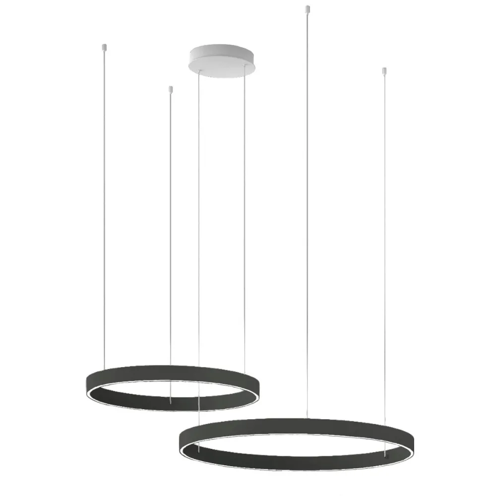 La suspension GAME BIS S80+S100 est un luminaire contemporain composé de deux élégants cercles lumineux de 80 et 100 cm de diamètre, créant un effet à la fois spectaculaire et raffiné. Fixée à un socle de plafond robuste et équipée de trois variateurs d'intensité, cette lampe offre un éclairage bidirectionnel grâce à ses diffuseurs en silicone opale blanc qui projettent la lumière vers le haut et vers le bas. Cette configuration assure un éclairage uniforme et enveloppant de la surface, tout en utilisant le plafond comme réflecteur naturel, agrandissant ainsi l'espace et créant une ambiance particulièrement esthétique.