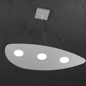 Suspension réalisée avec une plaque métallique de forme douce et irrégulière peinte en différentes finitions (gris, sable ou blanc). La force du produit consiste à ne pas utiliser de LED intégrées mais des ampoules Gx53 qui, une fois montées, affleurent la plaque métallique et peuvent être facilement remplacées de l'extérieur. Ampoule exclue.
