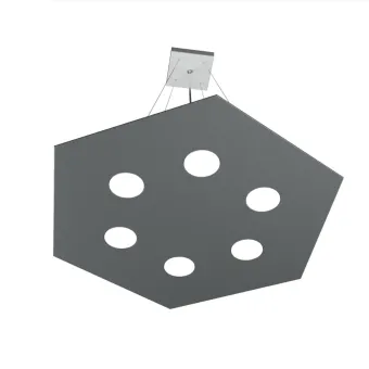 Collection de lampes hexagonales composées de plaques métalliques peintes en différentes finitions, BLANC, GRIS, SABLE, MARRON, GRIS ANTHRACITE, FEUILLE D'ARGENT, FEUILLE D'OR ou FEUILLE DE CUIVRE. Le lustre est équipé de câbles en acier et de fil électrique réglable en hauteur. La suspension monte six douilles dans la partie inférieure et une dans la partie supérieure avec connexion GX53 pour ampoules led de max 9W exclues. Il est possible de faire varier l'intensité de la lumière grâce aux ampoules spéciales dimmables qui peuvent être choisies séparément.