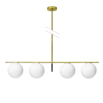 La structure du JUGEN 1744.68 est extensible en installant les tiges incluses dans l'emballage afin de l'installer à la hauteur souhaitée, la fine structure est entièrement en métal de couleur OR avec détail noir, tandis que les diffuseurs sont 4 bols en verre blanc laiteux qui laissez la lumière traverser tout l'environnement sans éblouir.