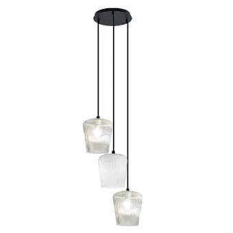 Suspension moderne réalisée en verre opale blanc nervuré et transparent, une couleur qui, au niveau optique, peut rappeler une teinte froide, naturelle ou chaude, certainement influencée par le type de meuble, classique ou moderne, et décider de la température, s'il s'agit d'une ampoule de 3000° K, 4000°K ou froid 5000°K. Un plafonnier à trois lumières réglable en hauteur selon vos besoins d'éclairage. Une suspension adaptée pour éclairer des surfaces d'appui telles que des tables à manger, des péninsules ou des bureaux ou pour être placée au centre de la pièce comme un joli cluster de lumière. Installation facile pour une touche de couleur et un rendement lumineux illimité.