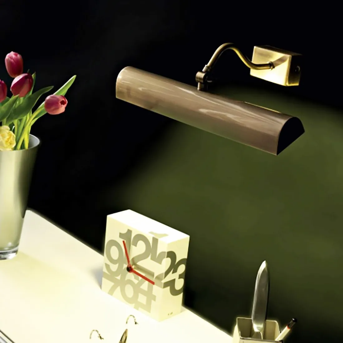 Applique en métal bruni recommandée pour les miroirs, les tableaux, les niches... partout où il est nécessaire d'éclairer des points spécifiques du mur vers le bas. Simple et fonctionnel grâce à l'articulation sur la tête qui permet un faisceau lumineux plus ou moins grand selon votre besoin.
