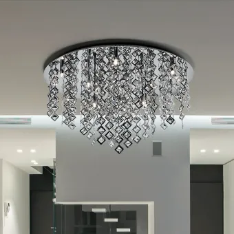 Le plafonnier Galassia produit une série de reflets inimaginables, grâce à la base chromée accompagnée de nombreux cristaux carrés entourés d'un joint chromé qui forment un ensemble brillant et harmonieux. Sa taille est de 80cm de diamètre et une projection de 44cm. Il va sans dire que les rayons lumineux produits se diffusent dans tout l'environnement avec des reflets sur mille surfaces, créant un éclairage étincelant.