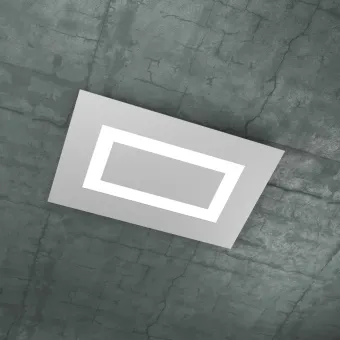 Plaque métallique peinte en différentes finitions unies en blanc, gris ou sable. Diffuseur en méthacrylate blanc. Le plafonnier supporte quatre douilles 2G11 pour deux ampoules led 20W et deux ampoules led 10W. Ampoule exclue.