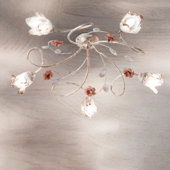 Pour caractériser le plafonnier est la présence de diverses roses en métal, travaillées et décorées à la main qui embellissent la structure. L'éclairage est diffusé à travers les ampoules non incluses dans le plafonnier et se reflète doucement sur les murs, faisant de la lampe un meuble.
