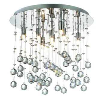 Monture circulaire et douille en métal chromé. Sphères de cristal broyées. Le plafonnier dispose de huit douilles G9 pour ampoules halogènes, basse consommation ou LED. Ampoules halogènes incluses.