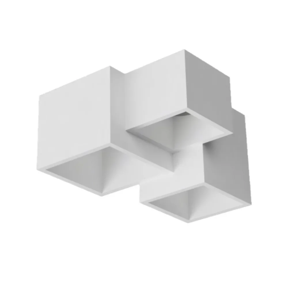 Le plafonnier en plâtre PALP 3000 présente un design moderne, parfait exemple de fonctionnalité et de design épuré, adapté à différents styles d'ameublement. Sa composition de trois spots cubiques de différentes tailles, disposés à différentes hauteurs, crée une figure géométrique originale et captivante.