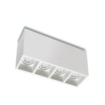Plafonnier au design moderne avec lumière à émission unique. Caractérisé par un parallélépipède à l'intérieur duquel se trouvent 4 spots installés individuellement avec des espaces spéciaux créés. La lumière qui sort de la partie inférieure est facilement adaptable à tout type de besoin. Corps en plâtre blanc ou à peindre avec des aquarelles spéciales. Le plafonnier est équipé de quatre douilles GU10 pour ampoules LED de 5W max. Ampoules exclues. Etude et conception par Belfiore 9010